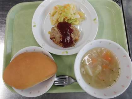 献立 ミルクパン、アップルチーズハンバーグ、コールスローサラダ、ABCスープ、牛乳