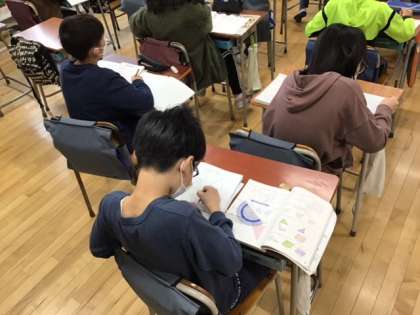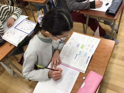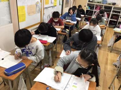 算数の時間です。「ステップアップ算数」5年生の総まとめをしています。