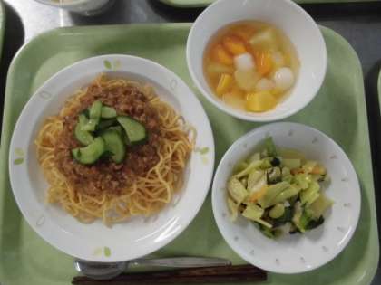 献立 ジャージャー麺、青大豆入りゆで野菜、白玉フルーツポンチ、牛乳