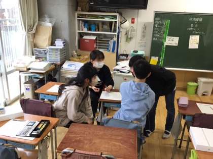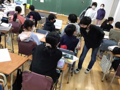 学級活動の時間です。「3学期係報告会」まんがクイズ係が発表しています。