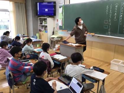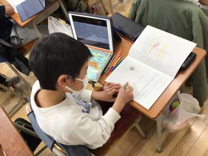 国語の時間です。「モチモチの木」じさまのはらいたは、本当だったのかどうかを考え、自分の意見をロイロノートで提出します。