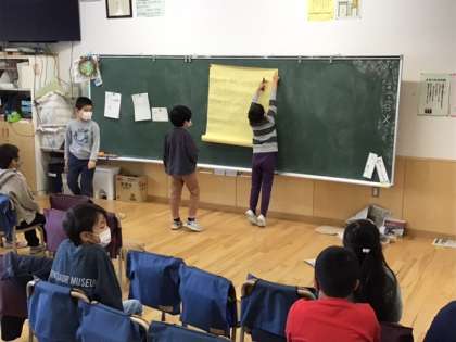 学級活動の時間です。3学期お楽しみ会の準備をしています。いろいろな出し物があるそうです。