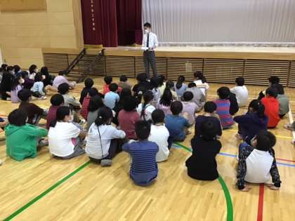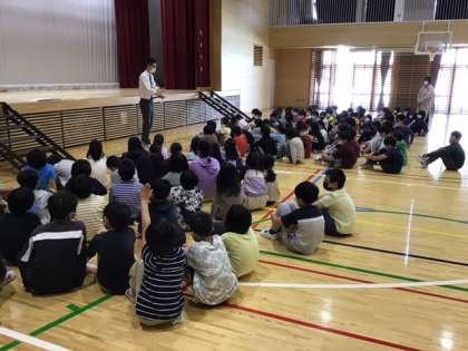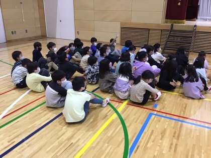 体育館で学年集会を開いています。4年生全員の気持ちを合わせて、良い学年を作っていきましょう!