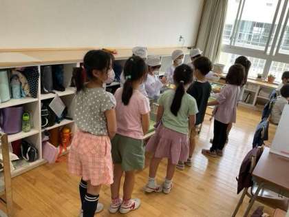 給食が始まって2日目です。2年生がテキパキと給食当番をしています。みんな成長しましたね。1年生の給食は。明日から始まります。カレーライスです。