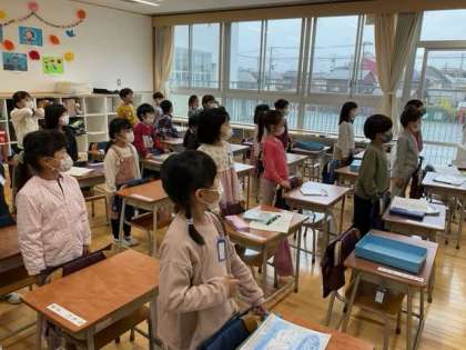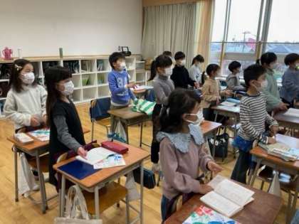 1回目の音楽朝会は、オンラインで行いました。「校歌」と「ありがとうの花」を各教室で練習しました。