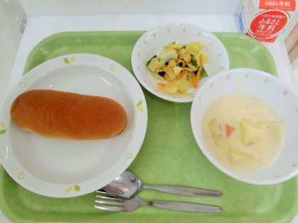 献立 黒砂糖パン、クリームシチュー、ひよこ豆入りゆで野菜