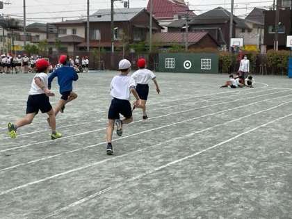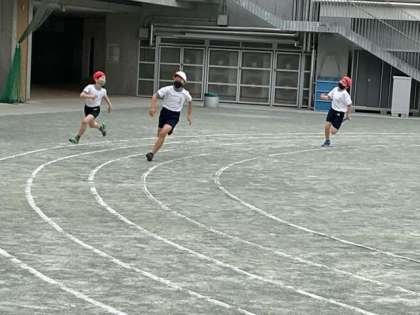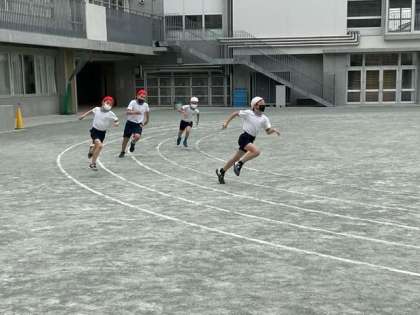 体育の時間です。短距離走に取り組んでいます。カーブの走り方がポイントになります。