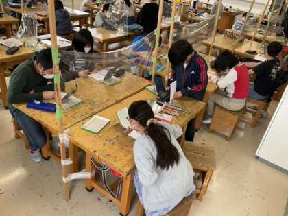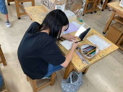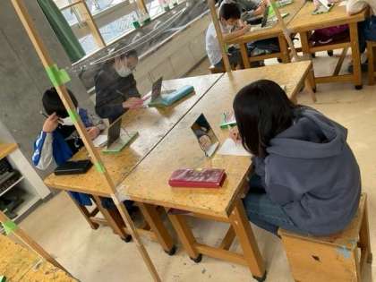図工の時間です。「自画像」写真のようにリアルに描くか、オリジナリティを出すか一人一人が工夫しています。