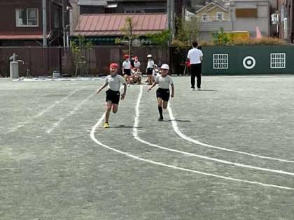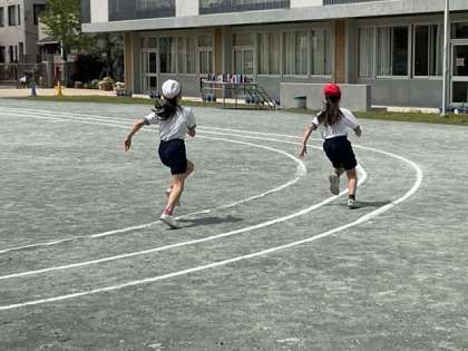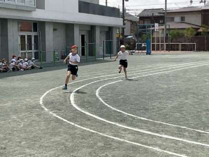 体育の時間です。短距離走のタイムを計測しています。友達を応援する姿が、すばらしいです。