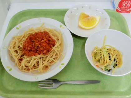 献立 ミートソーススパゲッティ、パリパリポテトのサラダ、河内晩柑、牛乳