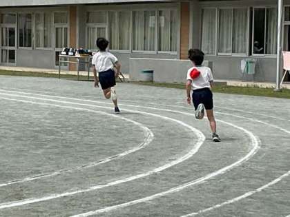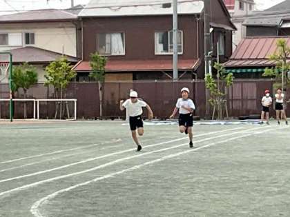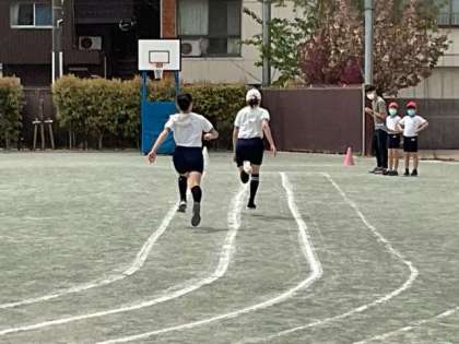 体育の時間です。短距離走のタイム計測中です。走りが力強くなってきました。