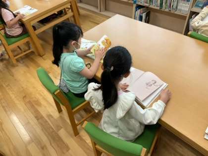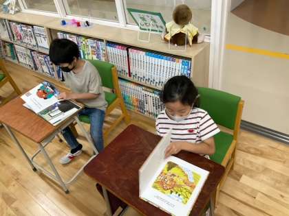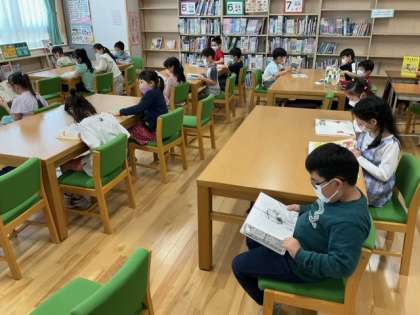 読書の時間です。みんな楽しそうに、夢中で読書をしています。お家でも、たくさん本を読んでください。