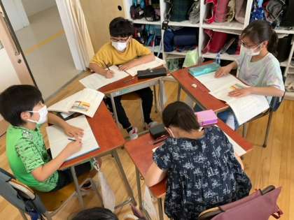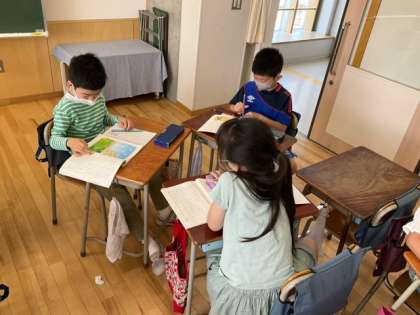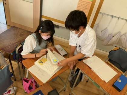 国語の時間です。「白いぼうし」本文の中に使われている「色」を探して、どんな効果があるのかを話し合っています。