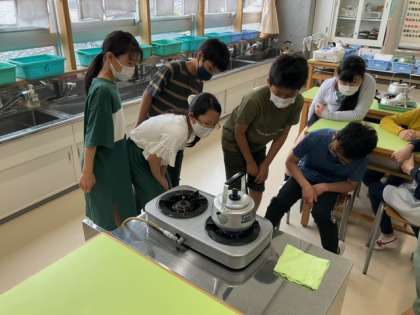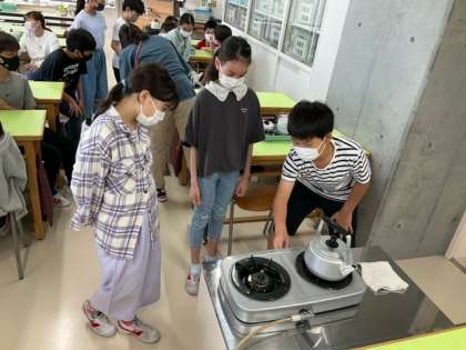 家庭科の時間です。ガスコンロの正しい使い方について、実技を通して学習しています。