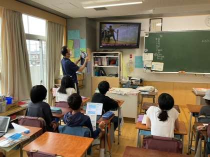 運動会で披露する「南中ソーラン」の映像を見ています。どの子の表情も真剣です。