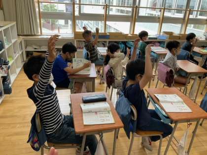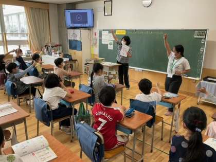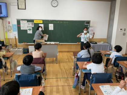 外国語活動の時間です。表情やジェスチャーを使って、英語であいさつをしています。