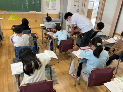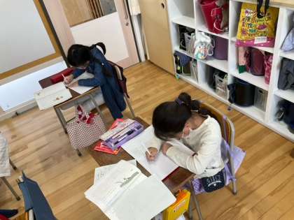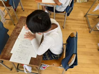 国語の時間です。「きつつきの商売」今までの学習を生かして、オリジナルの第3場面を考えています。