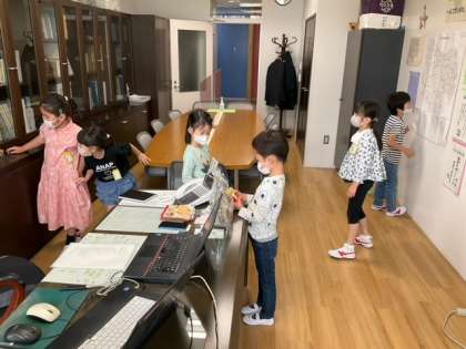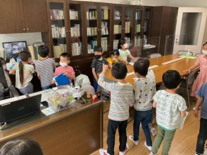 生活科の時間です。学校探検が始まりました。校長室にもたくさん探検にきてくれました。