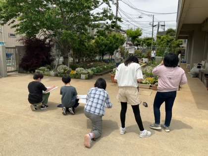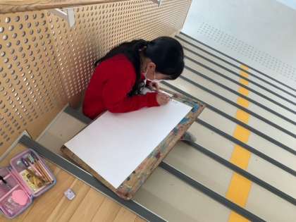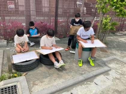 図工の時間です。「お気に入りの場所」慣れ親しんだ下北沢小学校。一人一人の思い出がつまっていますね。