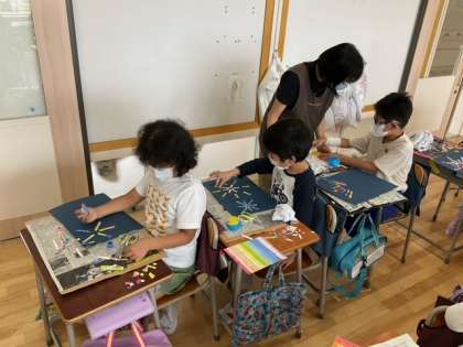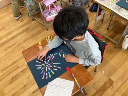 図工の時間です。とてもカラフルで、すてきな花火が打ち上がっています。