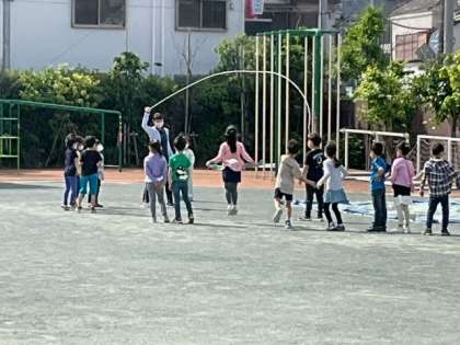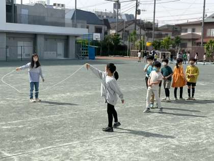 今朝のわくわくタイムでは、長なわとびに挑戦しています。