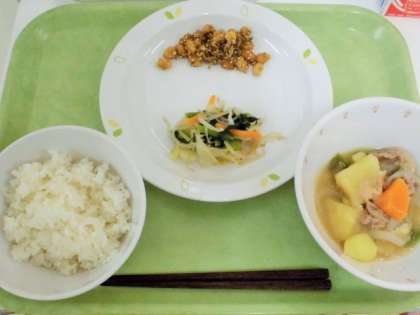 献立 ご飯、塩肉じゃが、大豆とじゃこの甘辛揚げ、小松菜サラダ、牛乳