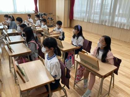 音楽の時間です。「音標」の学習をしています。いろいろな音符がありますね。リズム打ちで確かめています。