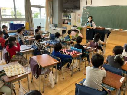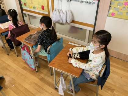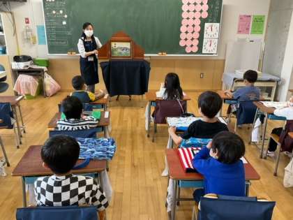読書の時間です。司書の先生が、「とかげの チョロリ」を読み聞かせてくれました。