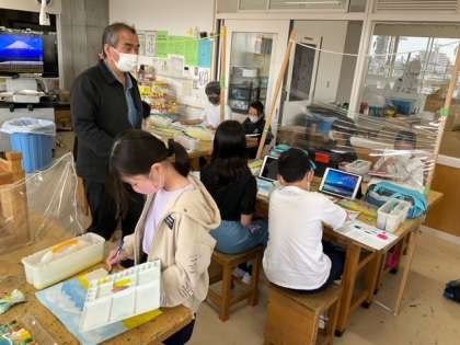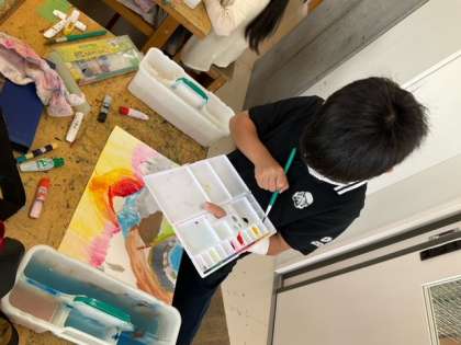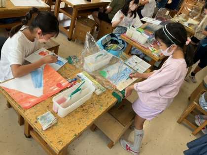 図工の時間です。「季節を感じて 私の富士山」自分の季節のイメージを、富士山をモチーフにして大胆に絵に表します。
