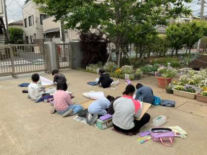 図工の時間です。「木々を見つめて」よく観察して、自分で作り出した色を使って、木を描いていきます。