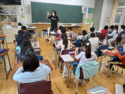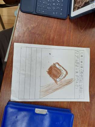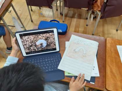 生活科の時間です。先生からiPadに送られてきたカブトムシの幼虫の写真を観察して、細かいところまで丁寧に描いていました。