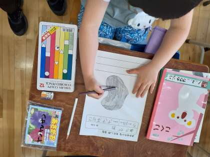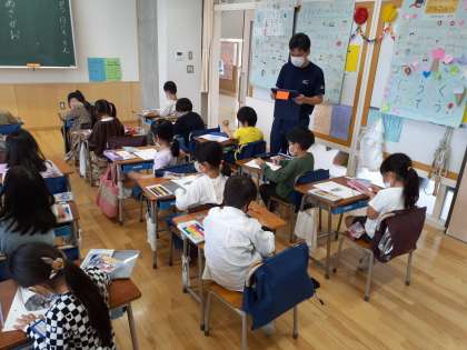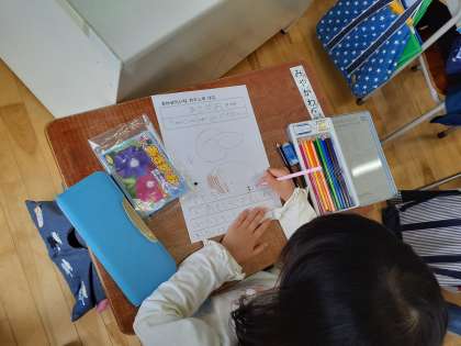 生活科の時間です。朝顔の種を見たりさわったりして、観察カードに丁寧に描けました。