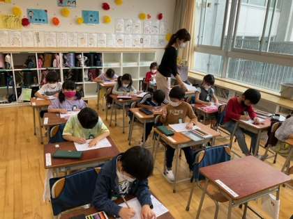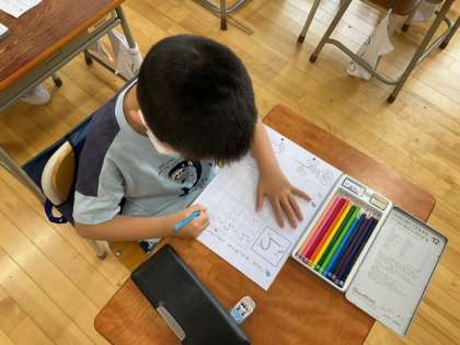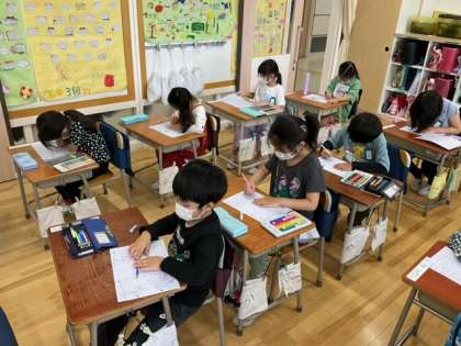 国語の時間です。ひらがなプリントに取り組んでいます。色えんぴつで絵に色を塗ることも、筆圧や鉛筆操作などにとって大事な学習です。