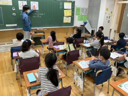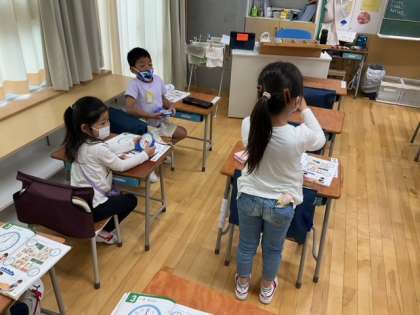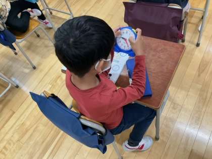 算数の時間です。「いま なんじ」時計をよむ学習をしています。とても大事な学習ですね。