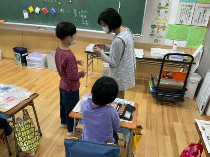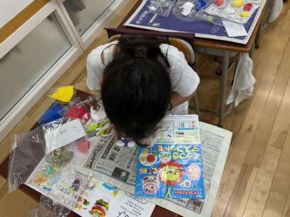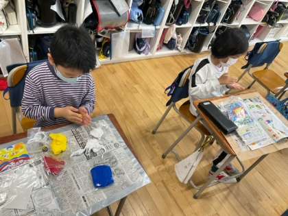 図工の時間です。「くっつきマスコット」形や色を工夫して、磁石でくっつくマスコットを作っています。
