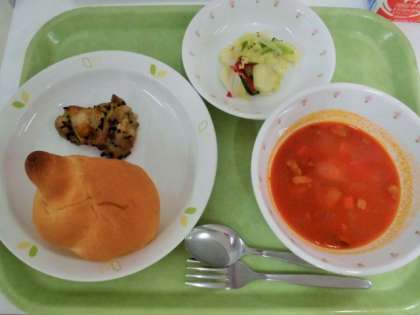 献立 ミルクパン、鶏肉のバジル風味、野菜のレモンドレッシングサラダ、ミネストローネ、牛乳
