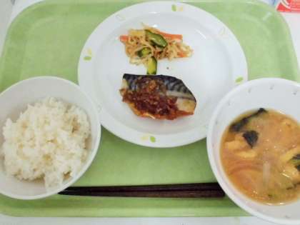 献立 ご飯、さばのねぎソース、もやしときゅうりのごま風味和え、じゃが芋と玉ねぎのみそ汁、牛乳