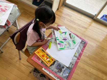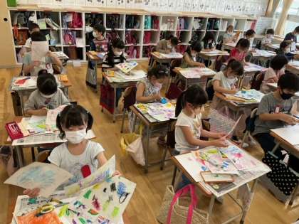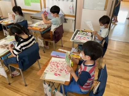 図工の時間です。「でこぼこから かたちをみつけよう」気に入った形をハサミで切って、さてどんな作品が出来上がるのかな?