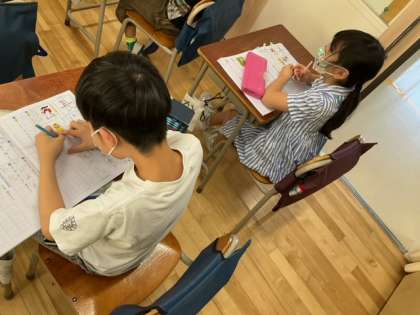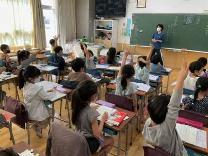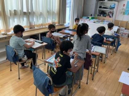 国語の時間です。「長」の字が入る文を考えています。「校長先生がお話をします」