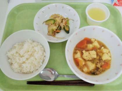献立 ご飯、豆腐のカレー煮、こんにゃくサラダ、りんごゼリー、牛乳
