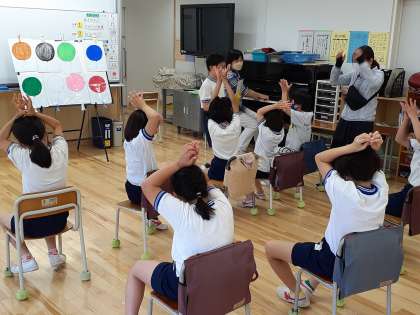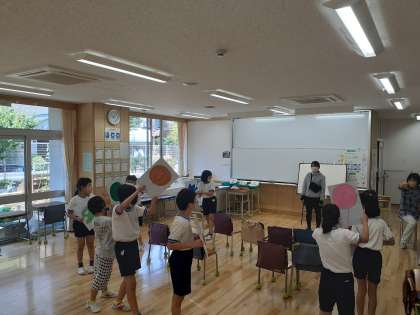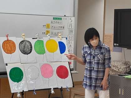 音楽の時間です。いろいろな色の風船や生き物になって、リズムにのって歌ったり、体を動かしたりしました。