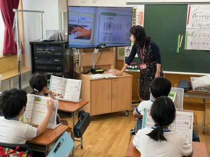 音楽の時間です。「ドレミで歌おう」音の高さに気をつけながら、歌ったりひいたりします。