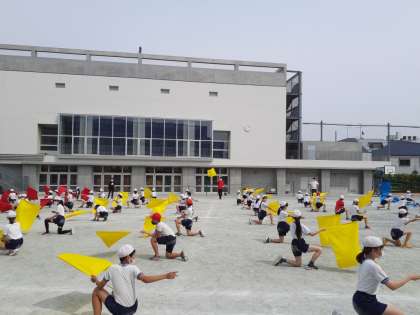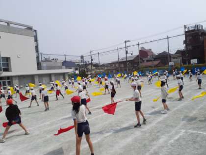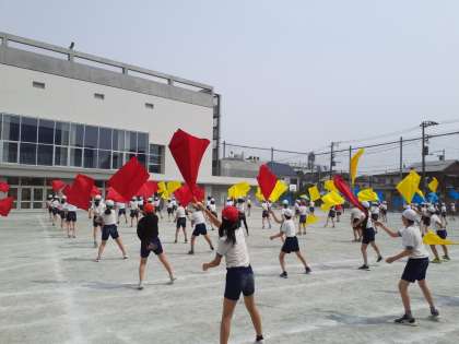 体育の時間です。初めて旗をもって練習しています。赤、青、黄色の旗が青空の下たなびいていて、かっこいいです。