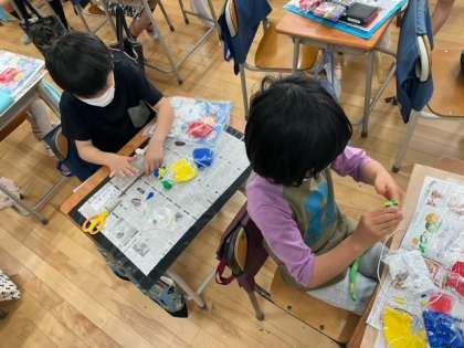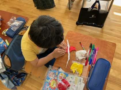 図工の時間です。カラフルなねん土で、「くっつきマスコット」を作っています。今日は、完成までがんばるぞ!