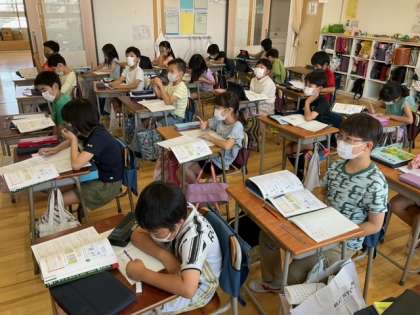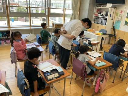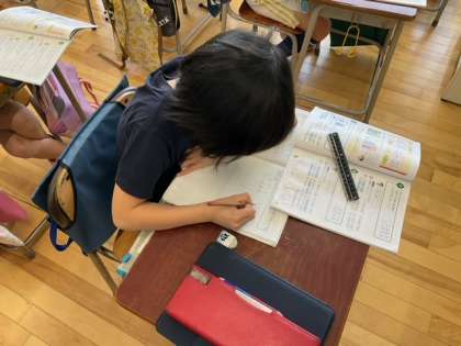 算数の時間です。「たし算とひき算」(4けた)ー(3けた)の問題を解いています。正確さが大事です。
