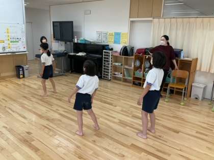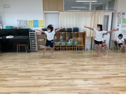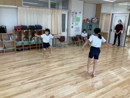 リトミックの時間です。リズムに乗って、いろいろな動きに挑戦しています。5、6年生は、運動会練習中です。