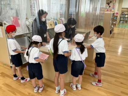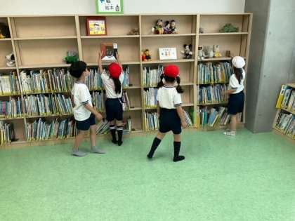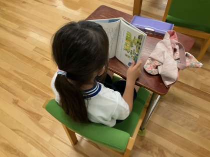 読書の時間です。「今日は、どの本を借りようかな?」読書の時間が、待ち遠しいですね。