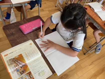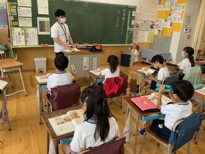 国語の時間です。「図書館たんていだん」学校の図書館では、どこに、どんな本があるのかを調べていきます。