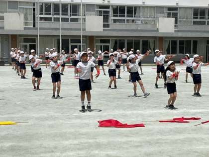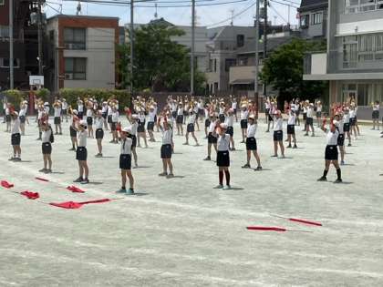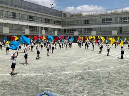 体育の時間です。運動会プログラムNo.13「The★しもきたフラッグSUPER5」日の日に演技の完成度が上がっています。