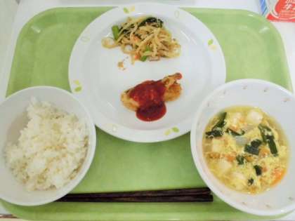 献立 ご飯、白身魚のチリソース、野菜のごまだれかけ、にらたまスープ、牛乳